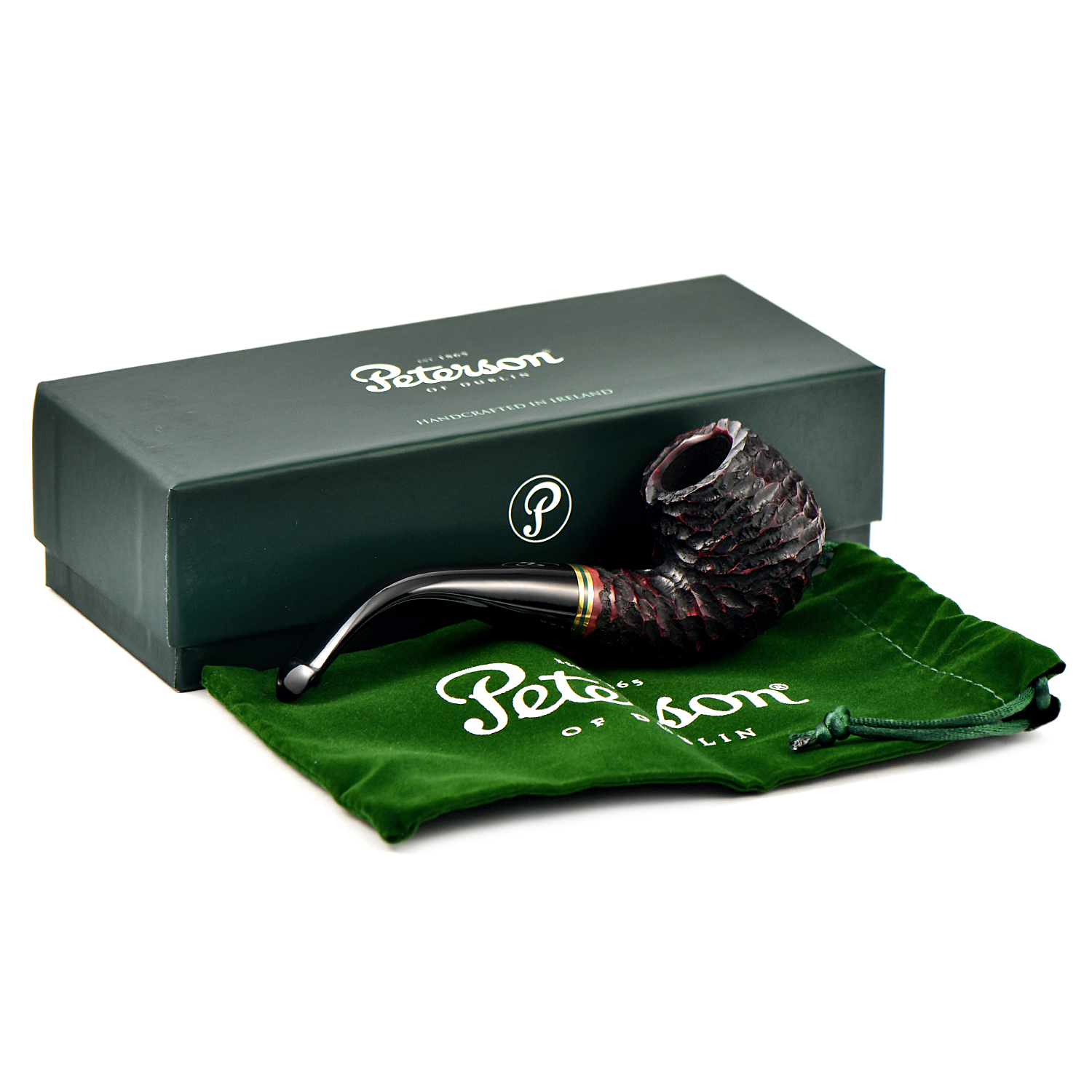 Линия Emerald Rusticated, характеризующаяся глубоким и скалистым рустом с потрясающими акцентами теплой латуни и зеленого акрила, демонстрирует фирменный стиль Peterson с классической презентацией, напоминающей зеленый пейзаж Ирландии. Доступная во множестве самых популярных классических форм, эта линия подчеркивает знаменитую рустированную торговую марку Peterson и традиционные мундштуки P-Lip, запатентованную конструкцию, которая, как доказано, уменьшает прикусывание языка.