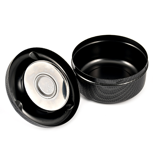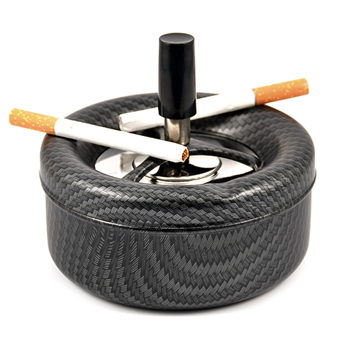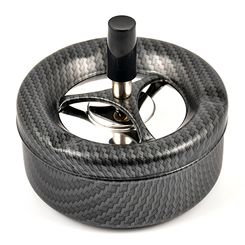 пепельница металическая, при нажатии на ручку, верхняя пепельница опускается с одновременным вращением и за счёт центробежной силы освобождается от пепла и окурков, которые попадют в нижнюю более вместительную пепельницу.