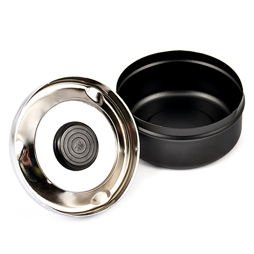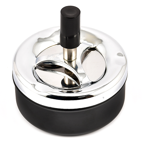 пепельница металическая, при нажатии на ручку, верхняя пепельница опускается с одновременным вращением и за счёт центробежной силы освобождается от пепла и окурков, которые попадют в нижнюю более вместительную пепельницу.