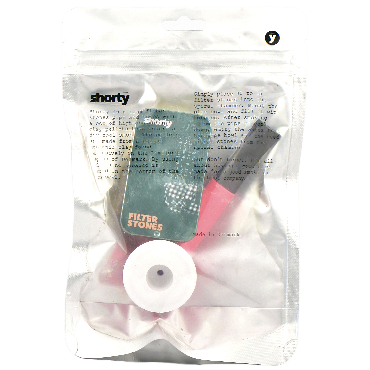 Все трубки Shorty имеют белую фарфоровую чашу с табачной камерой, содержащую такое же количество табака, как и сигарета, и их можно курить в течение 20 минут. После курения дайте трубке остыть, удалите пепел из чаши трубки и использованные камни из спиральной камеры.