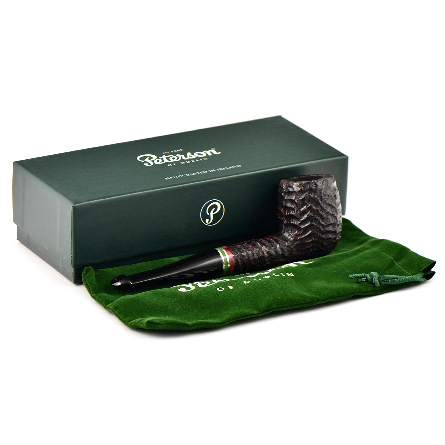 Линия Emerald Rusticated, характеризующаяся глубоким и скалистым рустом с потрясающими акцентами теплой латуни и зеленого акрила, демонстрирует фирменный стиль Peterson с классической презентацией, напоминающей зеленый пейзаж Ирландии. Доступная во множестве самых популярных классических форм, эта линия подчеркивает знаменитую рустированную торговую марку Peterson и традиционные мундштуки P-Lip, запатентованную конструкцию, которая, как доказано, уменьшает прикусывание языка.