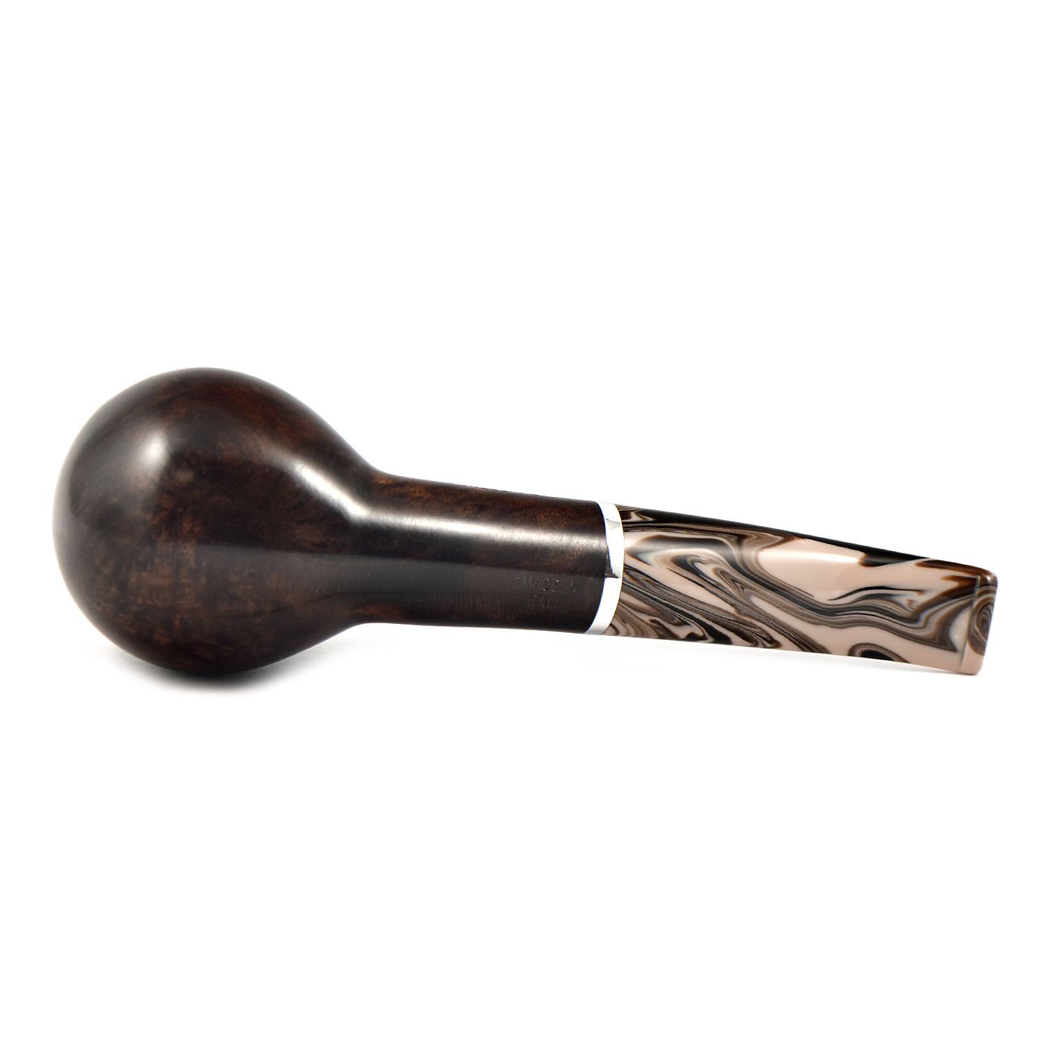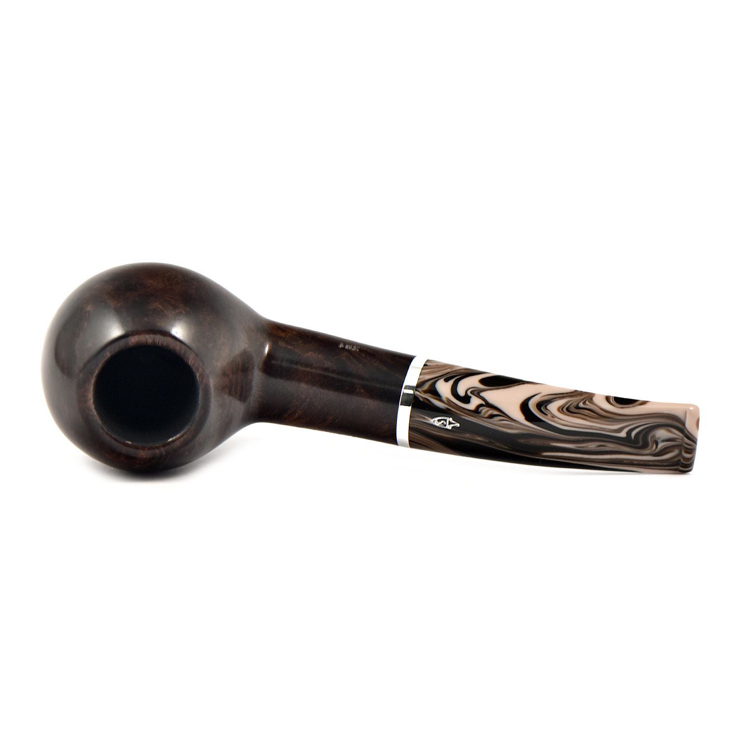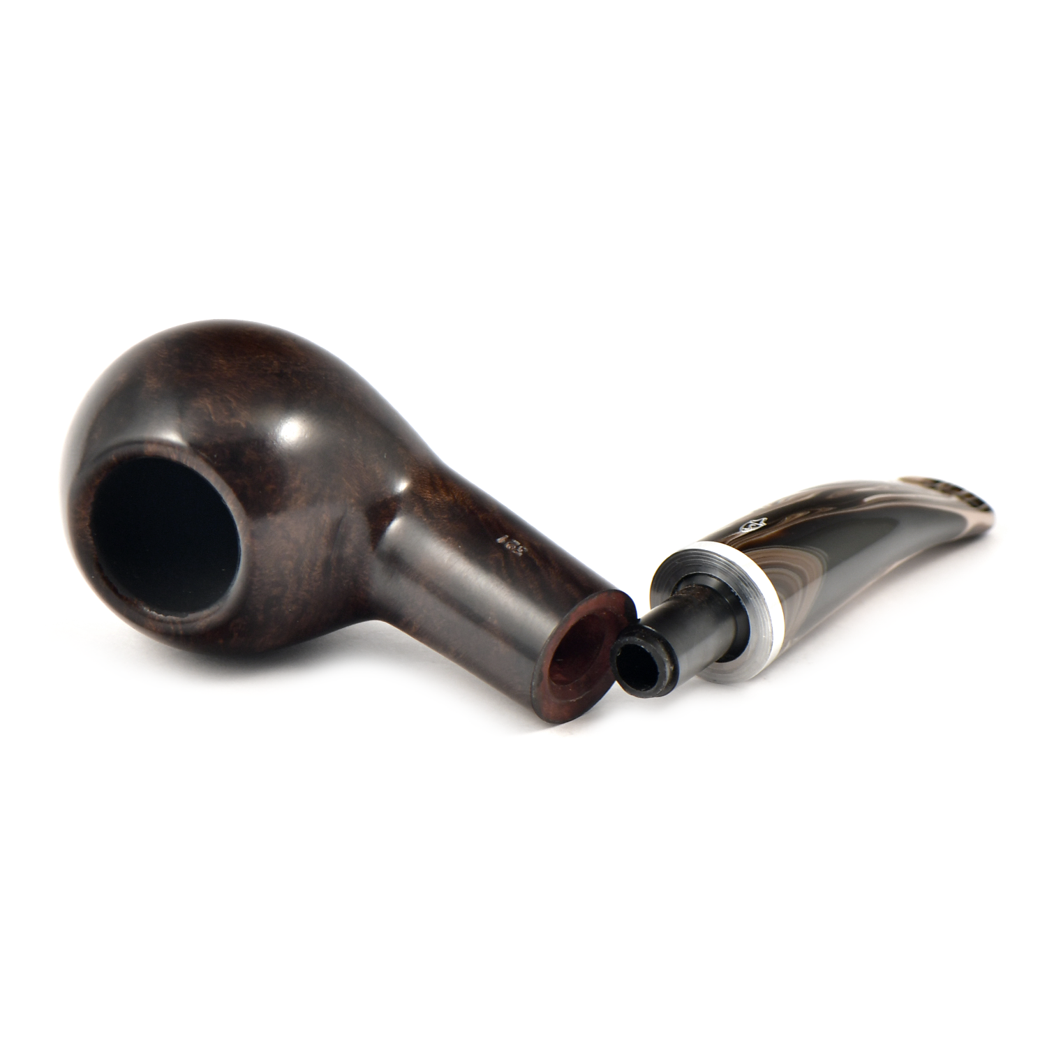 Эта трубка имеет темно-коричневую чашу с гладкой отделкой и черную чашу с рустованной отделкой, а также акриловый мундштук красивого коричневого меланжевого цвета.
