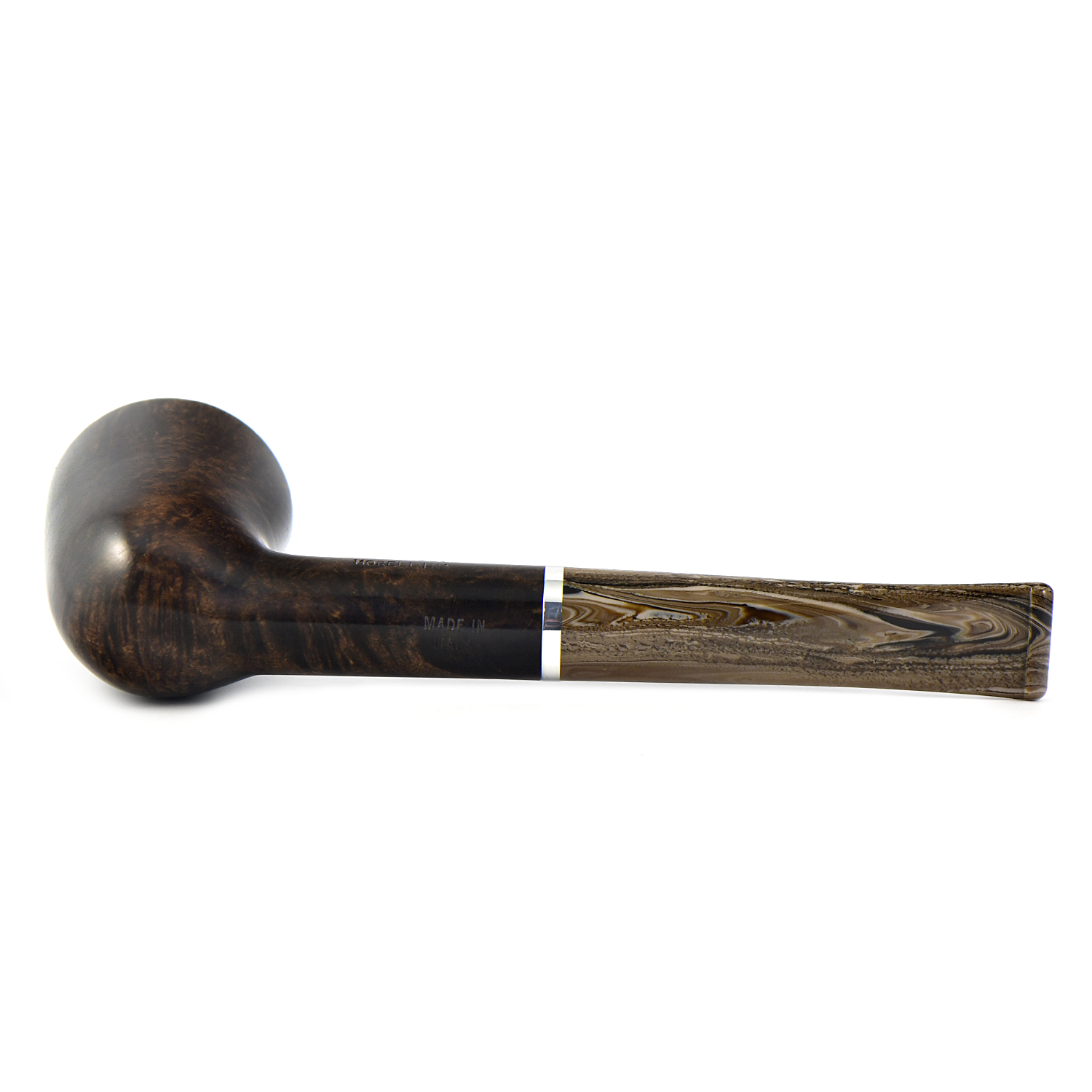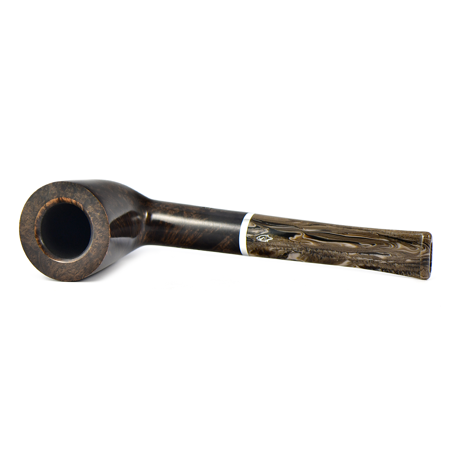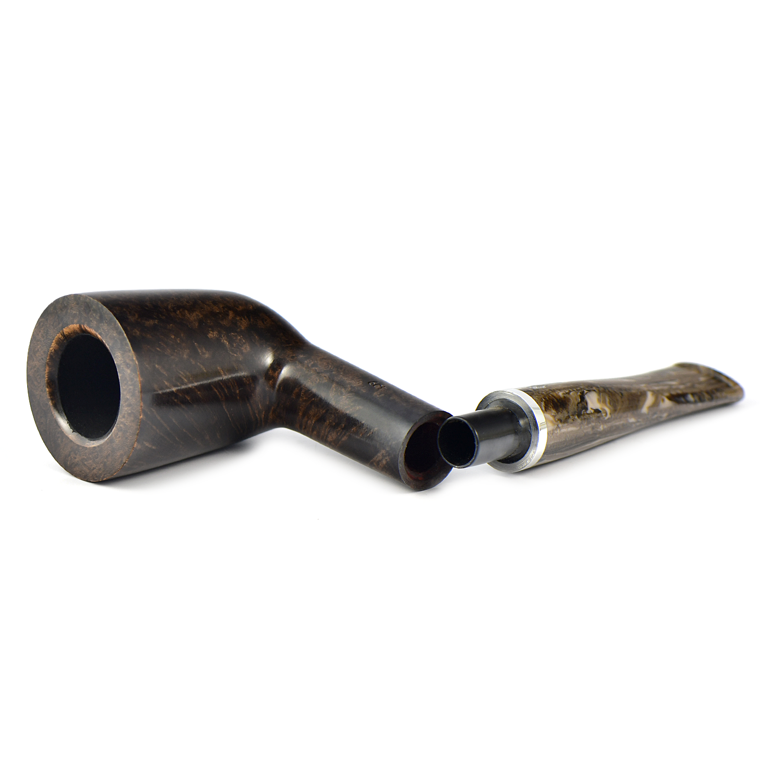 Эта трубка имеет темно-коричневую чашу с гладкой отделкой и черную чашу с рустованной отделкой, а также акриловый мундштук красивого коричневого меланжевого цвета.