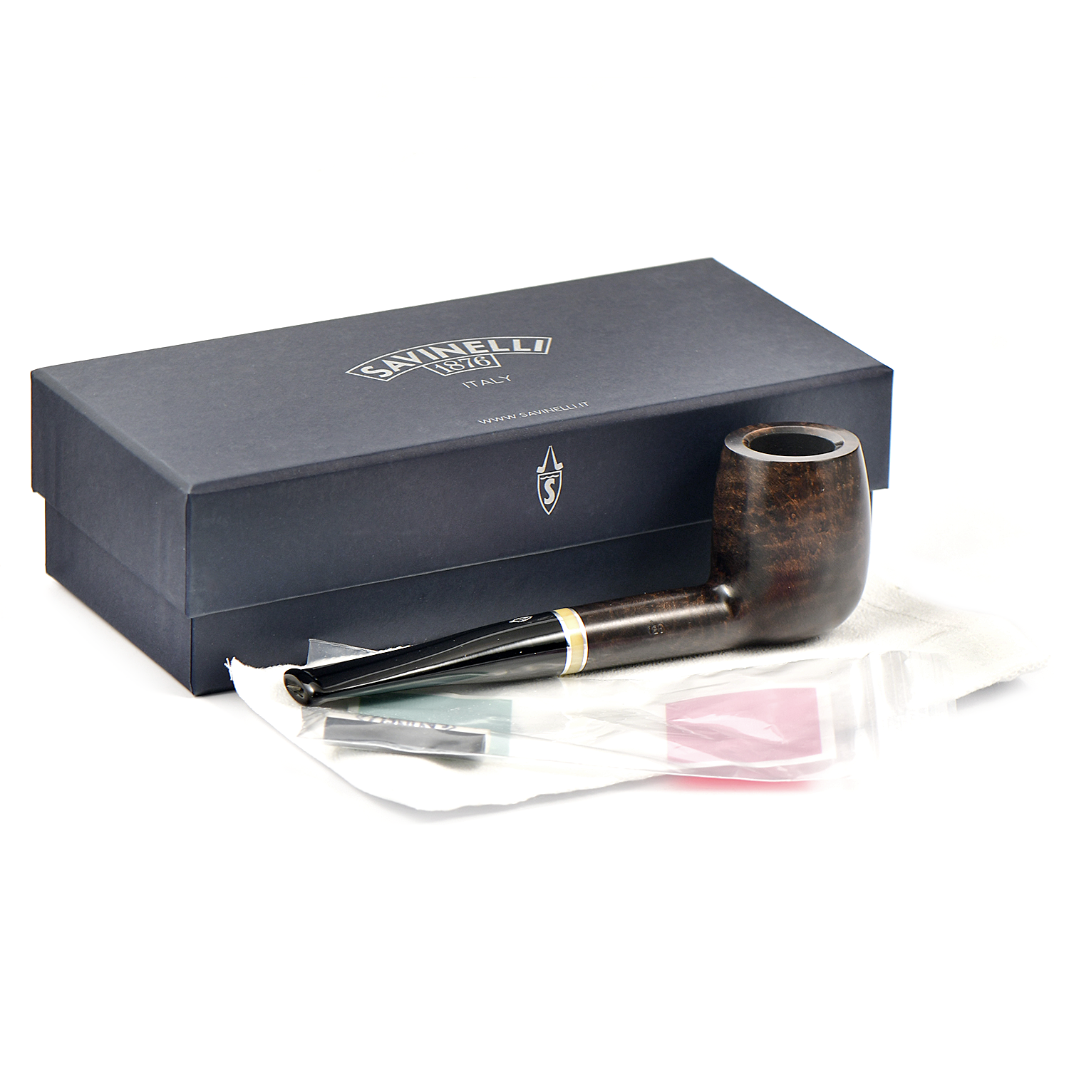 Историческое имя в линейке, Savinelli сделали рустованную и гладкую коричневую отделку с бежевым кольцом и черным акриловым мунштуком.