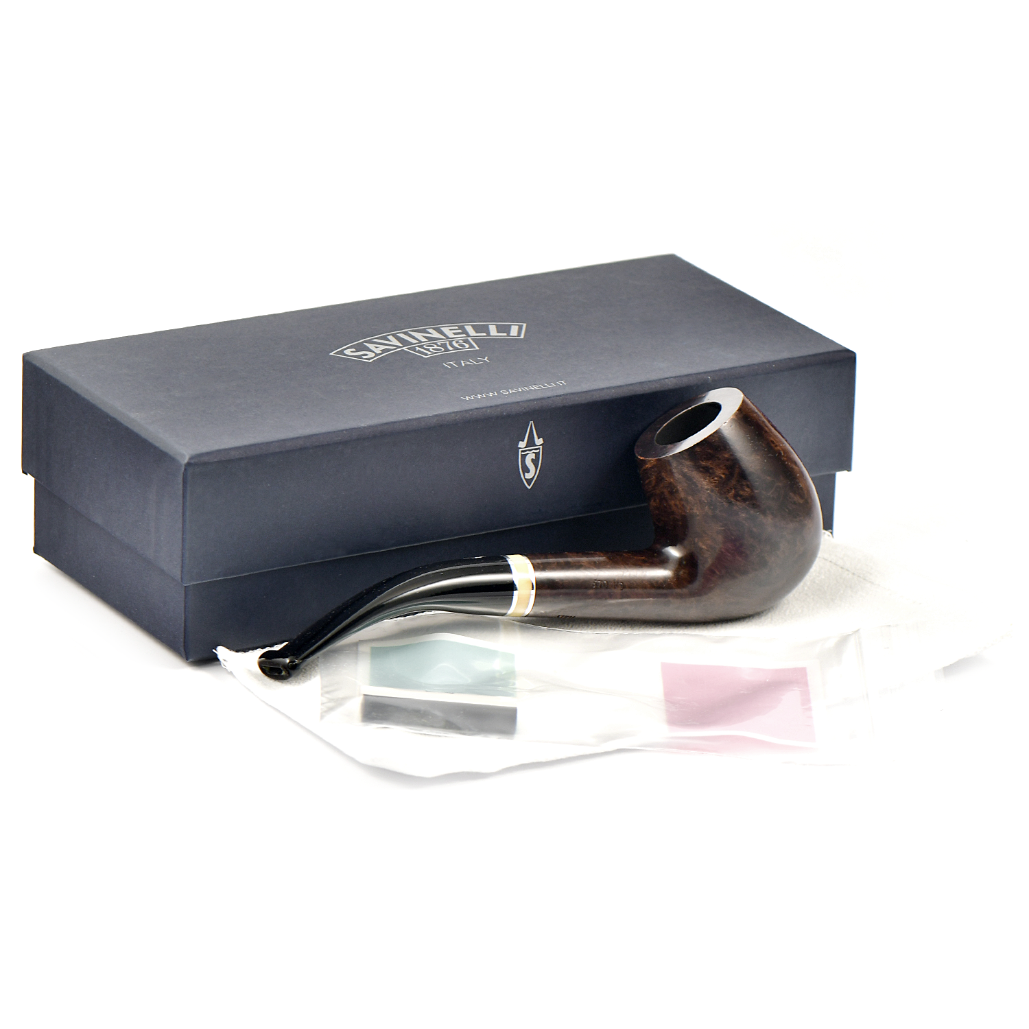 Историческое имя в линейке, Savinelli сделали рустованную и гладкую коричневую отделку с бежевым кольцом и черным акриловым мунштуком.