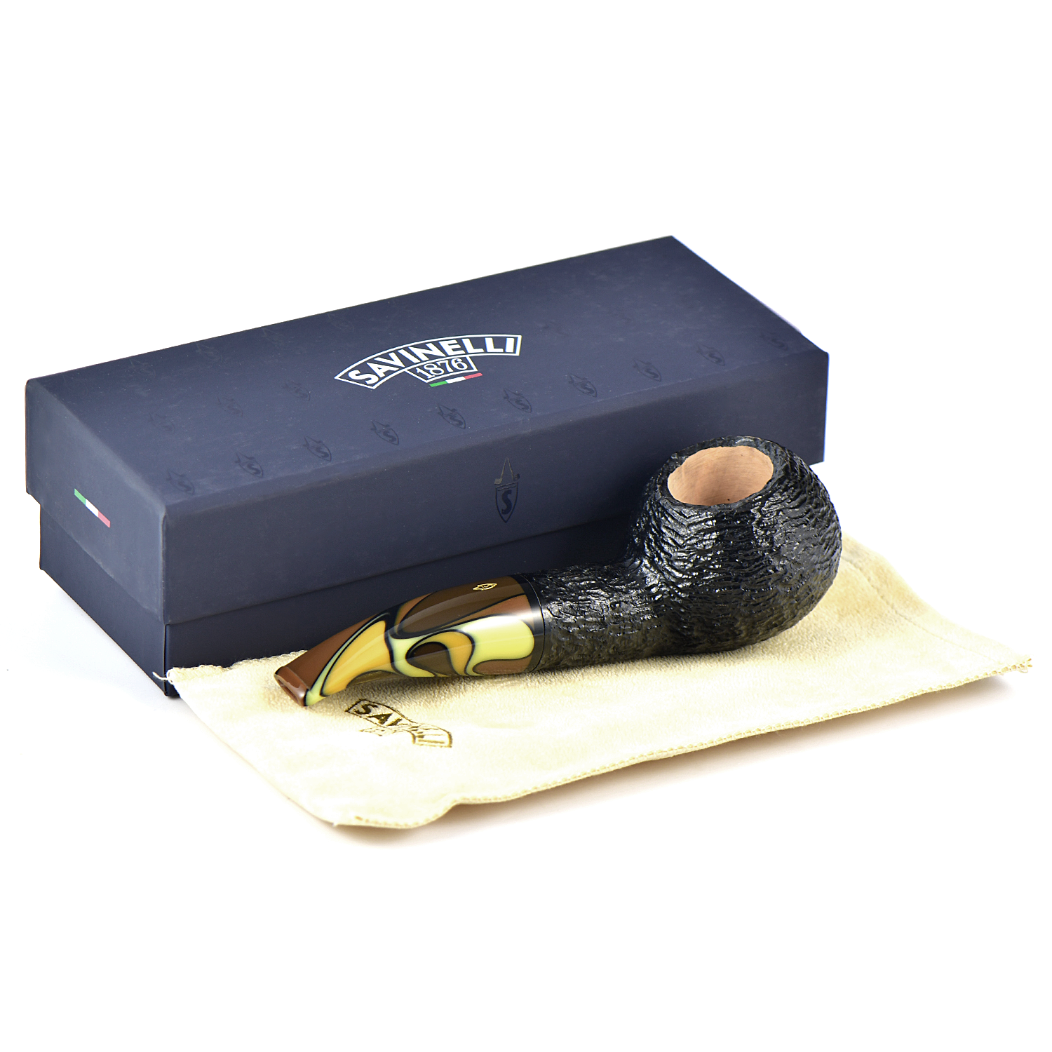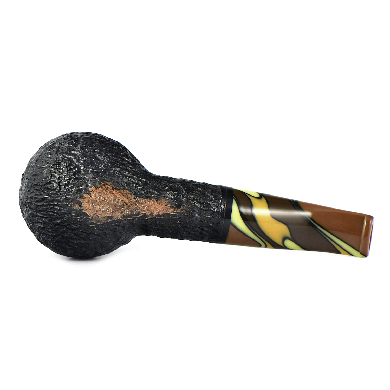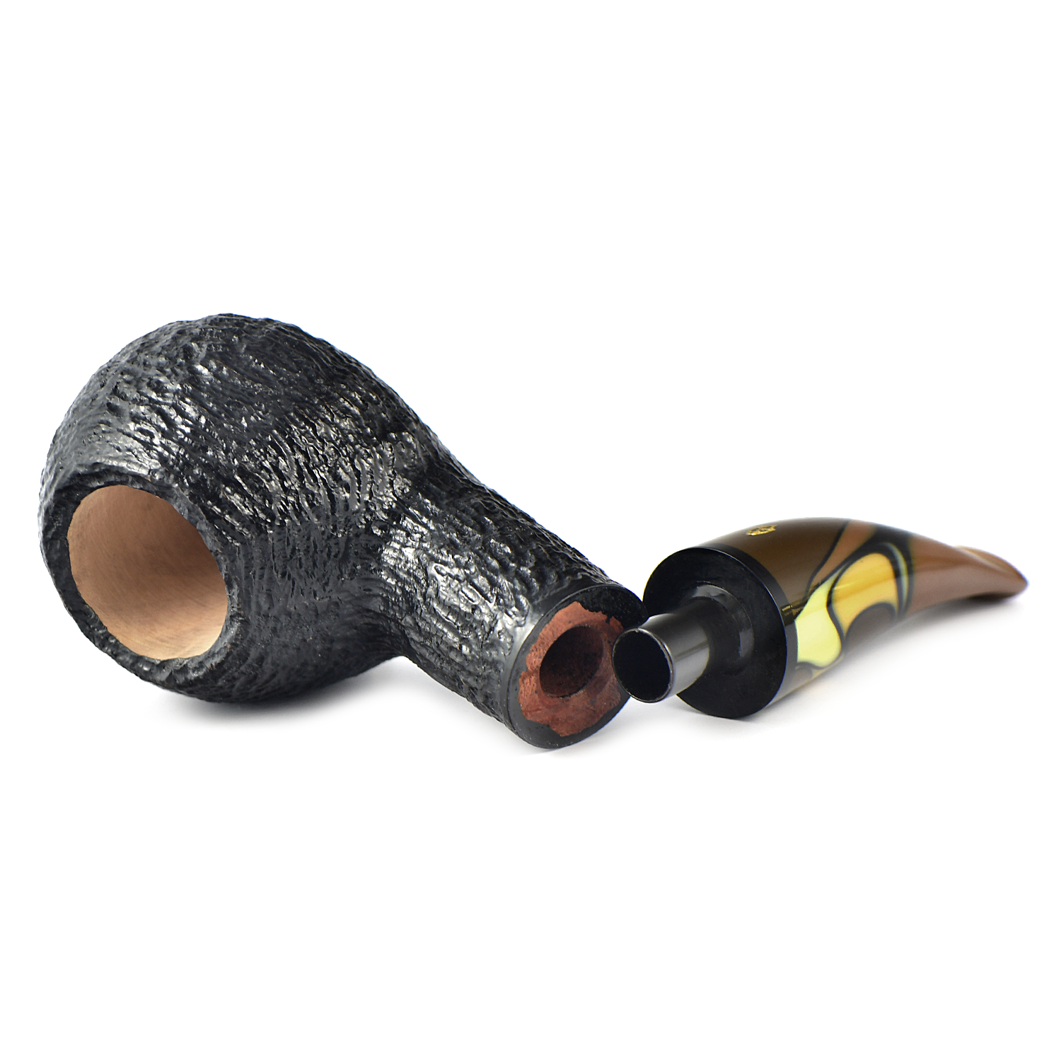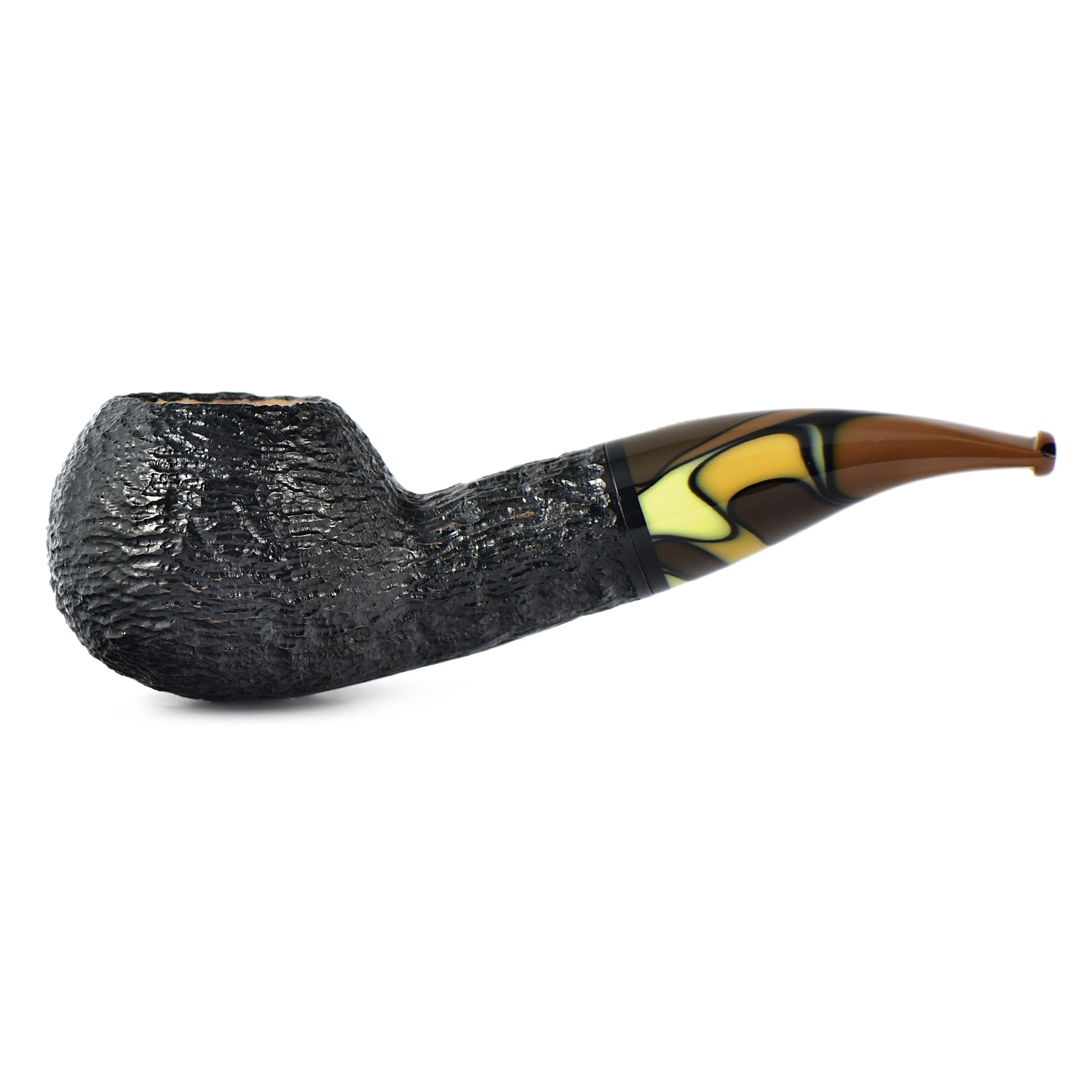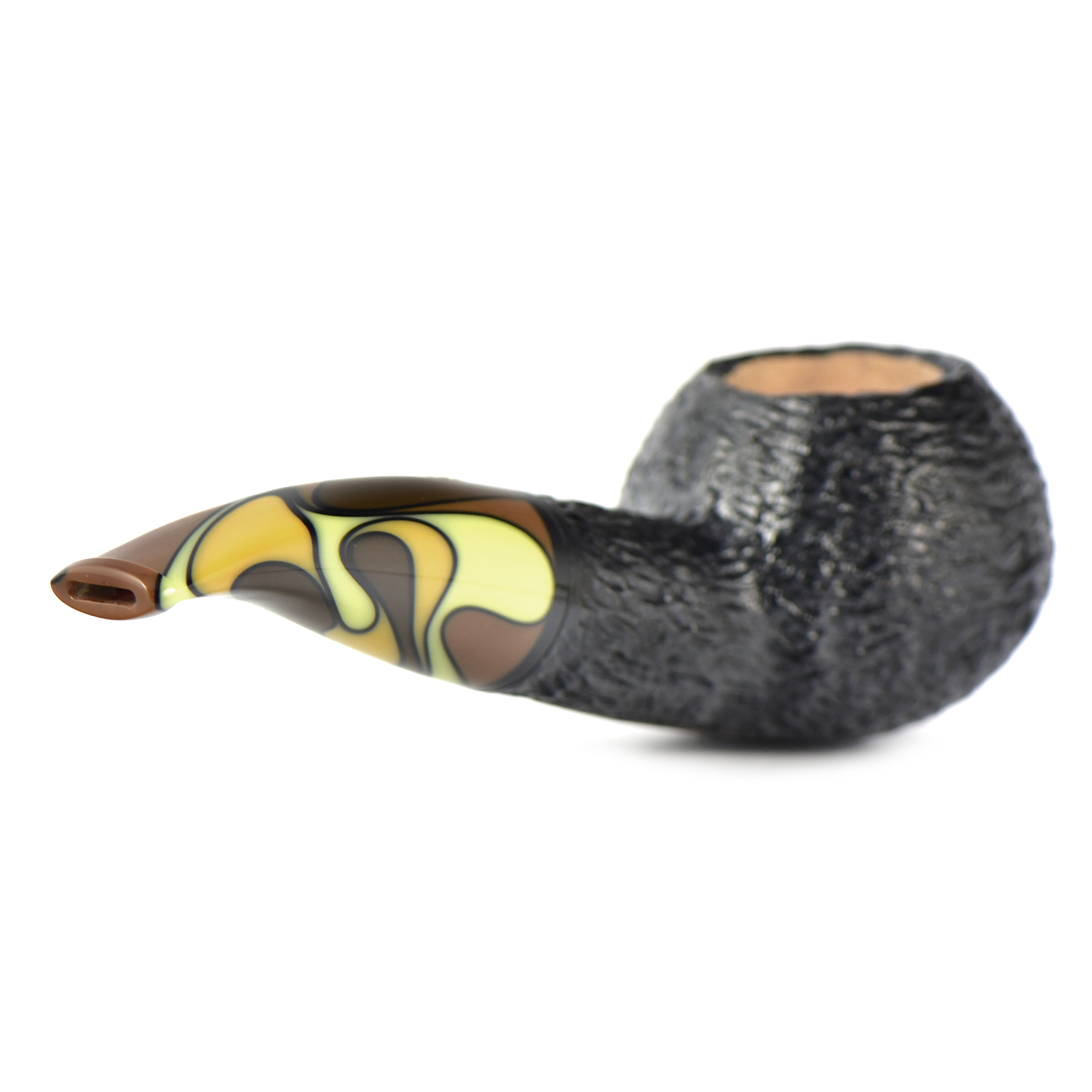 Акриловый мундштук с «волнистыми» землистыми цветами делает эту рустированную, чёрного цвета трубку очень теплой и интересной вещью.