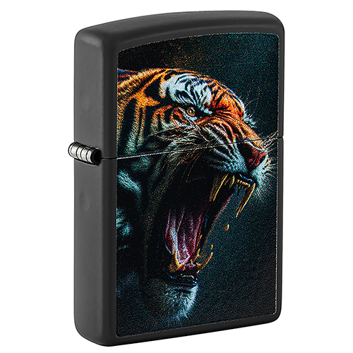Яростный и свирепый тигр реалистично рычит с поверхности этой классической зажигалки Black Matte с цветным изображением..
