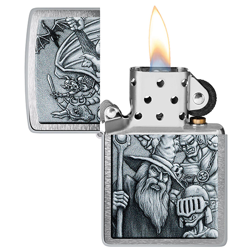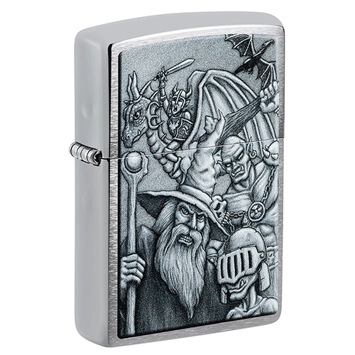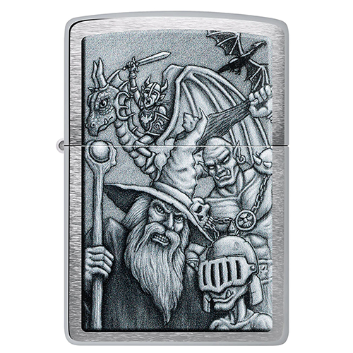 Окунитесь в другой мир с этой классической зажигалкой Brushed Chrome. Дизайн имитирует мифологическую сцену с гоблинами, волшебниками, драконами и многими другими фантастическими персонажами.