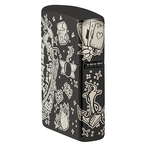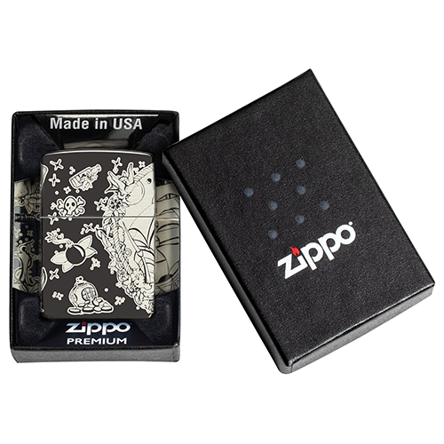 Отправляйтесь в море или в небо с этой морской зажигалкой High Polish Black. Zippo использовали технологию Laser 360°, чтобы окружить эту модель со всех сторон коллажем из знакомых пиратских символов, исполненных в стиле татуировок.