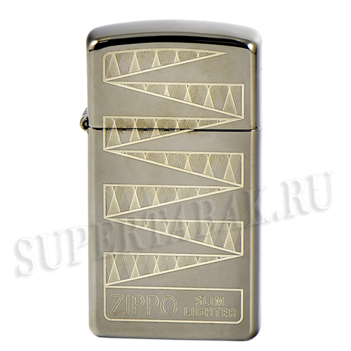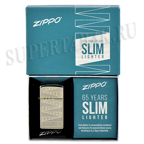 В 1956 году компания Zippo выпустила знаковую инновационную модель. Зажигалка, получившая название Zippo Slim, обладала привычными ветроустойчивыми свойствами, как и зажигалки классической формы, однако ее очертания были заметно заужены. В честь празднования 65-й годовщины с момента появления модели Slim компания Zippo выпустила специальную коллекционную зажигалку. Лестница из треугольников, нанесенная на корпус Black Ice по технологии лазерной гравировки и сверхчеткой детализации, напоминает оригинальную упаковку, в которой выпускались первые зажигалки линейки Slim.