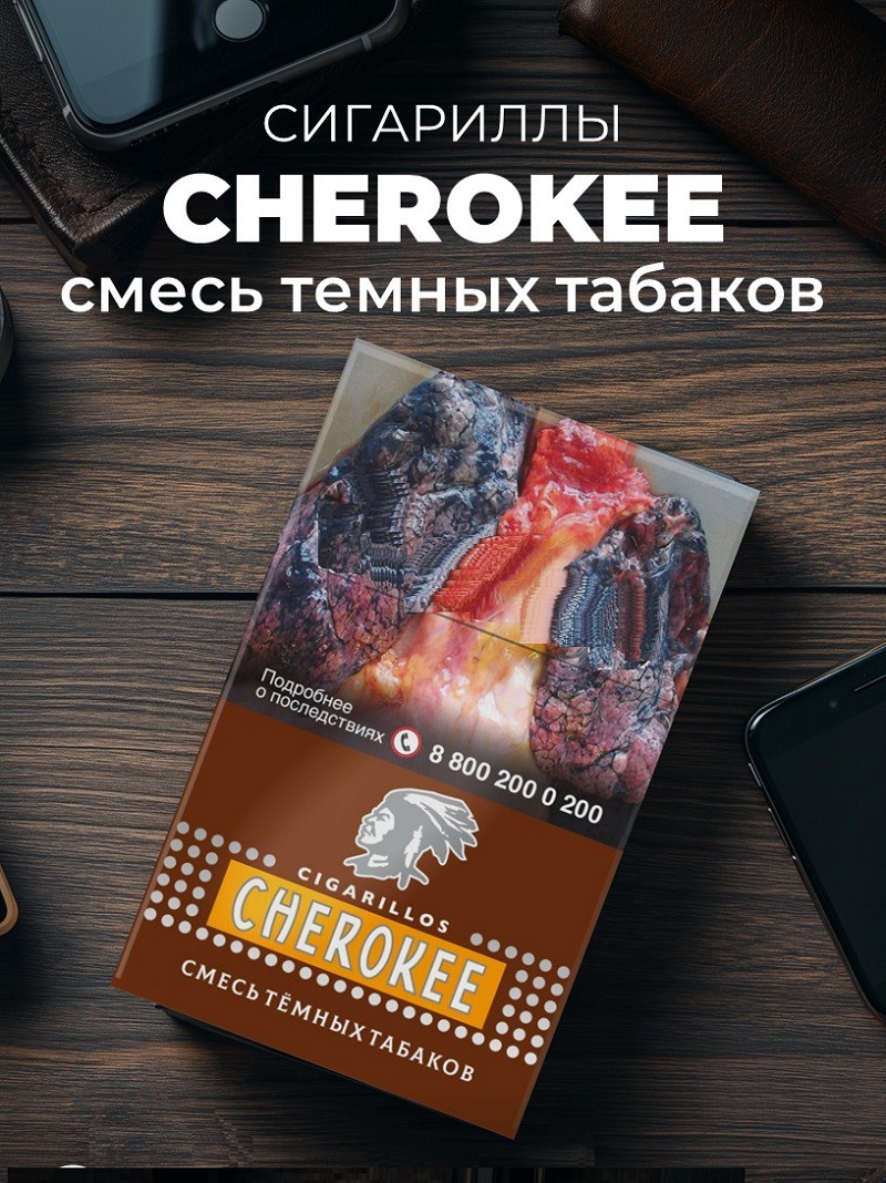 Сигариллы с фильтром "Cherokee - Смесь тёмных табаков" произведены машинным способом из 100% натурального табака. Сбалансированная смесь тёмных табаков теневой сушки Берлей из Бразилии, Малави, Бангладеш, прошедших дополнительную обработку высокосахаристыми соусами с последующей процедурой тостирования и сигарных табаков из Никарагуа, Доминиканы, Индонезии без добавления ароматизаторов. Натуральный, плотный вкус с оттенками орехов, специй, шоколада и поджареной хлебной корочки. 8 Октября 2025